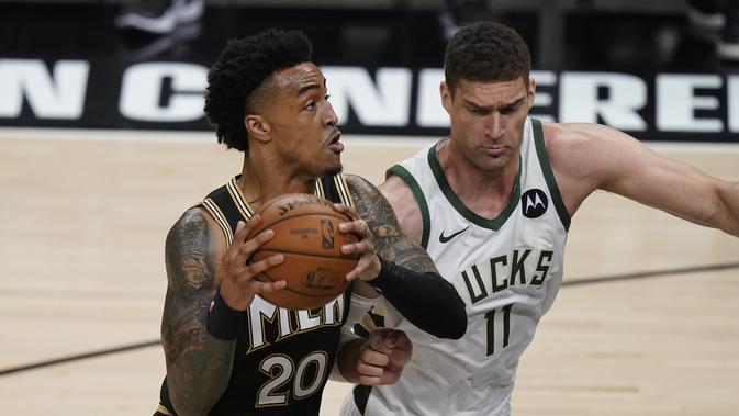 NBA Playoffs Bucks Hawks game 5. Atlanta Hawks revive series hopes cruise to Game 4 win minus Trae Young. Hawks guards Bogdan Bogdanovic left and Kevin Huerter cant stop Bucks center Brook Lopez from going to the basket for two of his 33 points during the first quarter in game 5.
