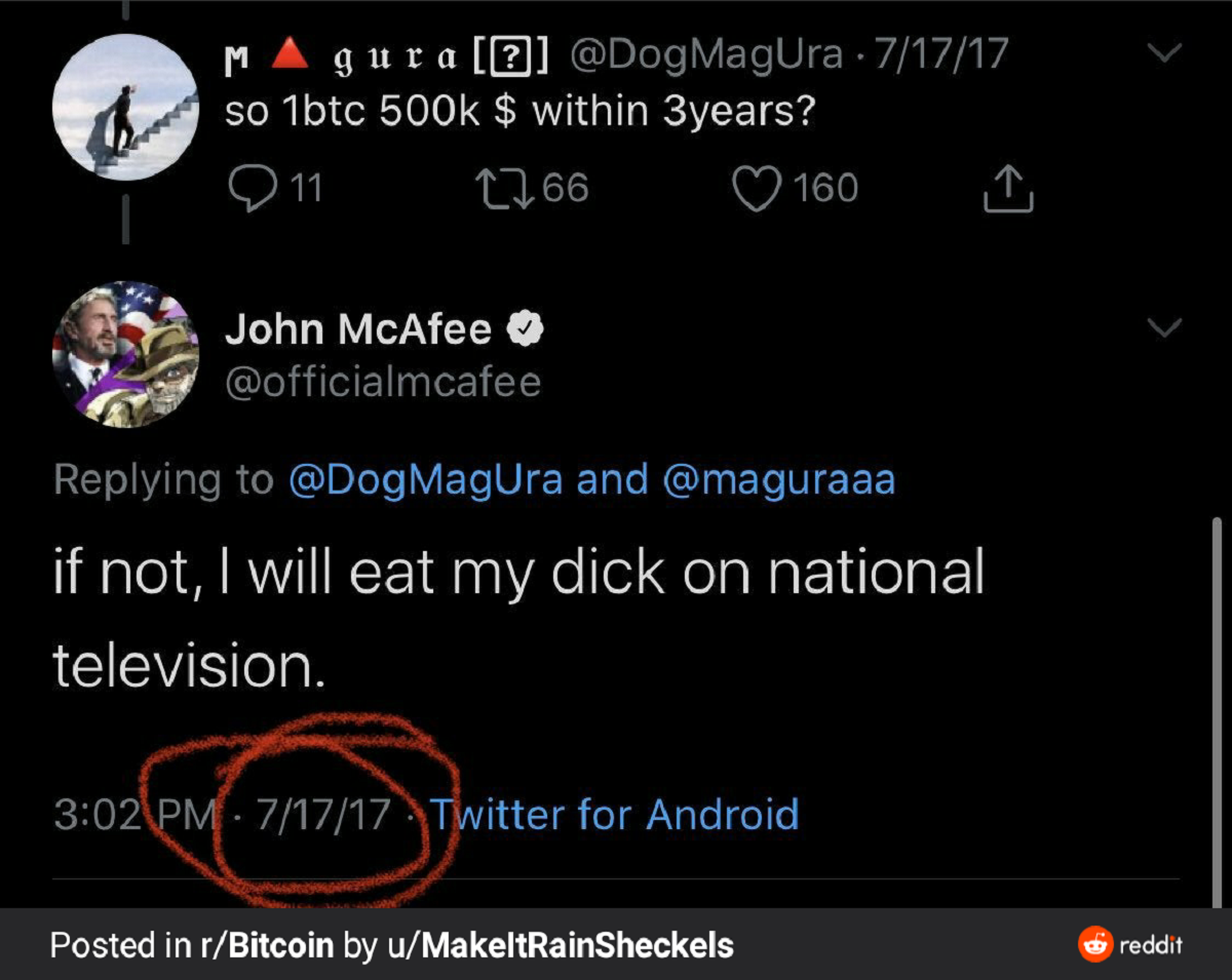 The scams are being shared on Twitter using phony accounts and the URL in the tweets leads to a website that very convincingly. As the major Bitcoin bull run of 2017 began to brew in July John McAfee bet that Bitcoin would continue upwards to USD 500000 by the end of 2020 or he would eat his private parts live on national television. -Bitcoin drops below 30K -China FUD -John McAfees passing -Elon trolls crypto twitter -Meme review deals a giveaway.